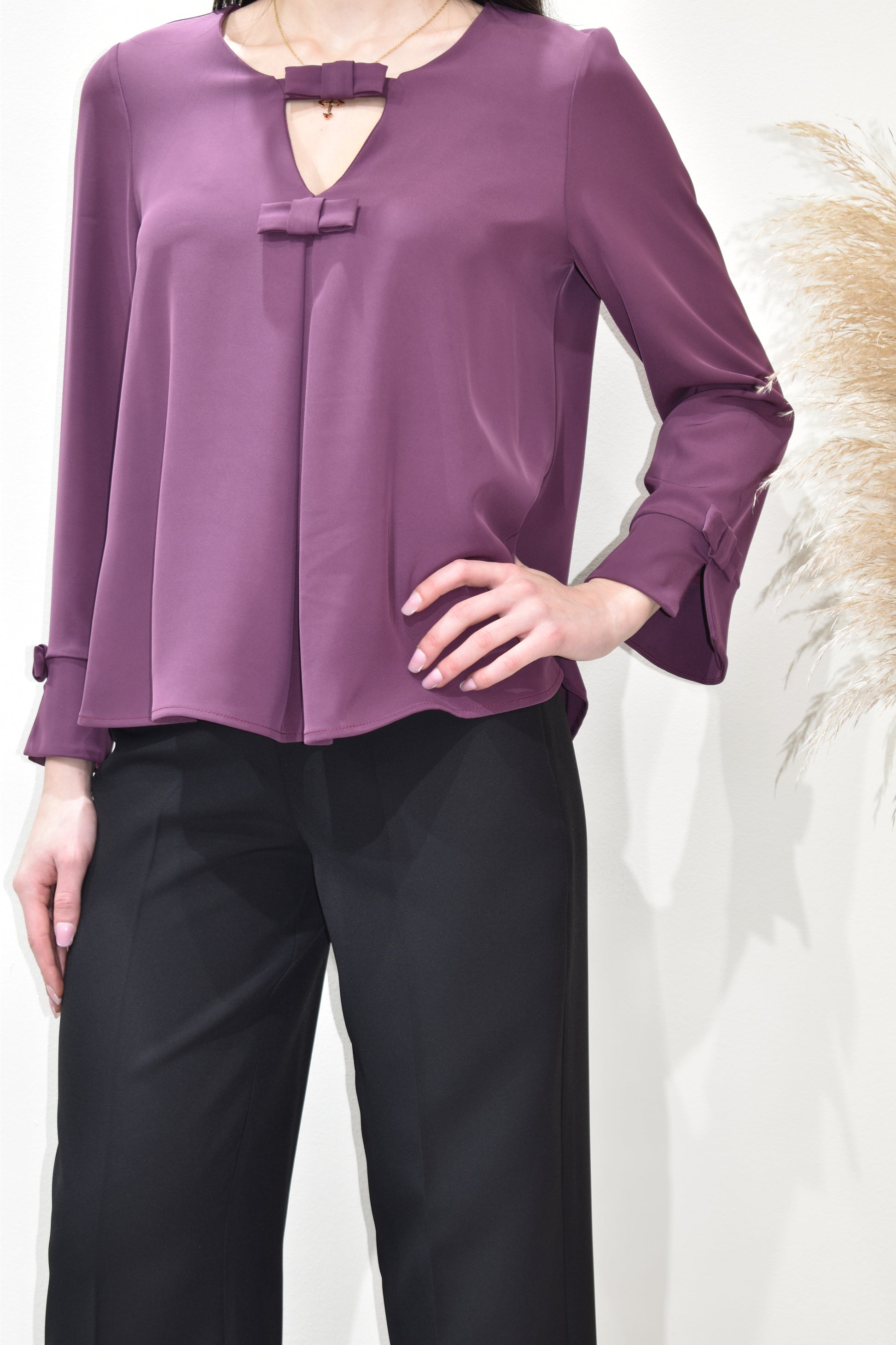 Le maniche lunghe hanno una linea morbida e si chiudono con un piccolo dettaglio a festone con fiocchetto, che riprende il tema decorativo del davanti.