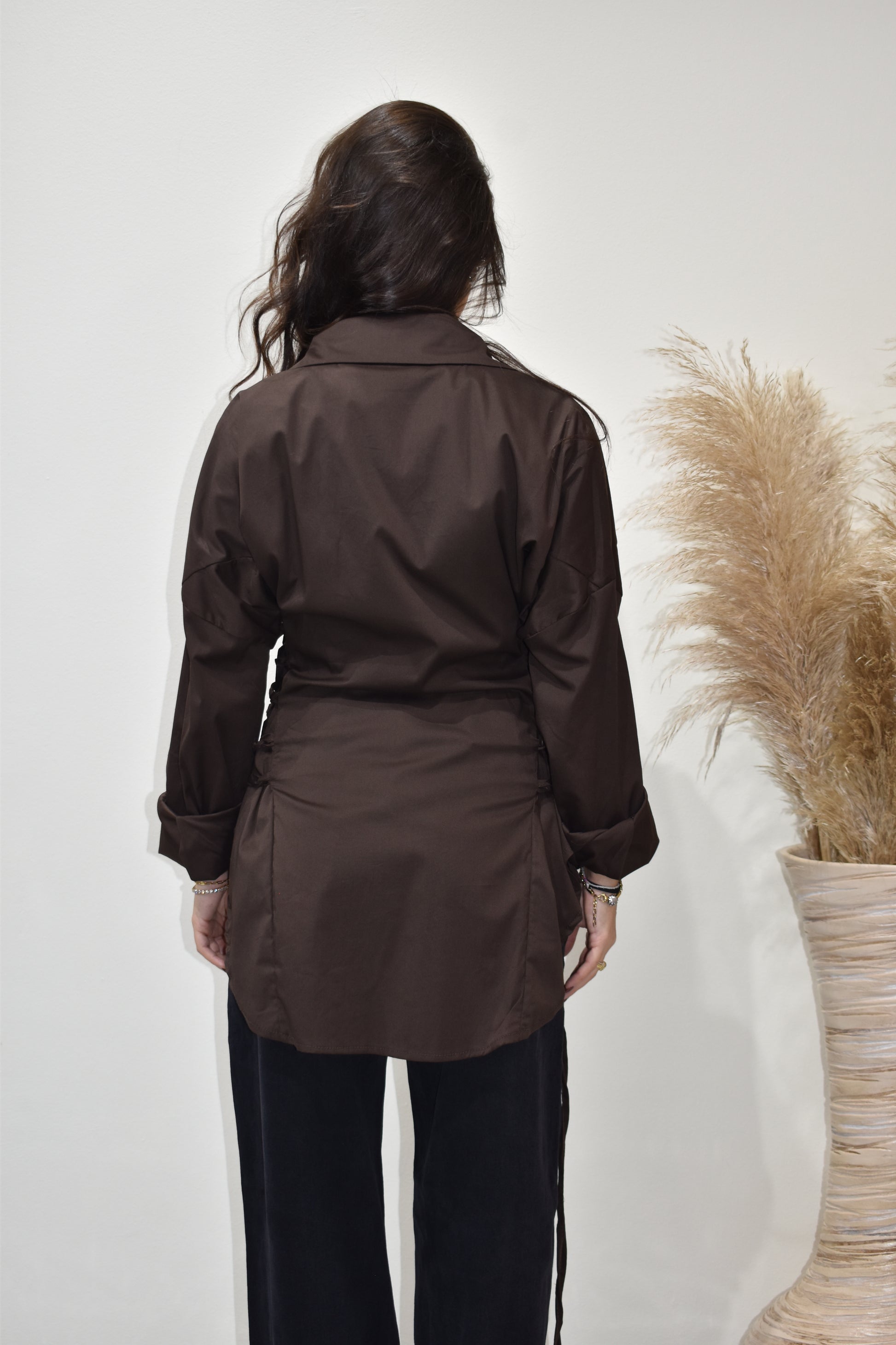 Camicia lunga in tessuto liscio color marrone cioccolato, dal design moderno e ricercato. Il modello presenta una chiusura frontale a bottoni e un colletto classico, mentre la particolarità è data dai lacci laterali regolabili che creano un effetto arricciato sui fianchi, permettendo di adattare la vestibilità e di enfatizzare la silhouette. Le maniche sono lunghe con polsini ampi e leggermente morbidi.Un capo originale e versatile, ideale sia come camicia strutturata sia come mini-abito da sovrapporre a pantaloni larghi per un look elegante ma contemporaneo.