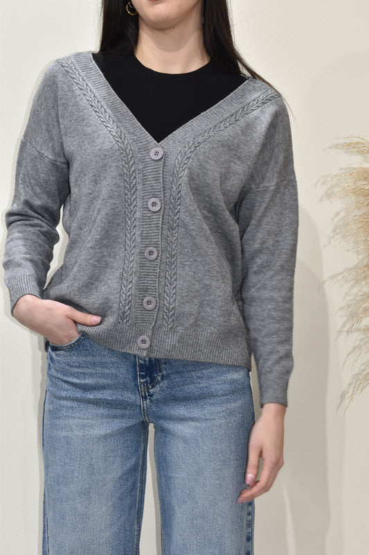 Cardigan in maglia morbida dal taglio confortevole, impreziosito da uno scollo a V con eleganti trecce decorative lungo l’abbottonatura. Le spalle leggermente scese e le finiture a costine donano un look moderno e armonioso. Versatile e raffinato, il cardigan Zahir è ideale per completare outfit quotidiani o più ricercati con un tocco di sobria eleganza. -