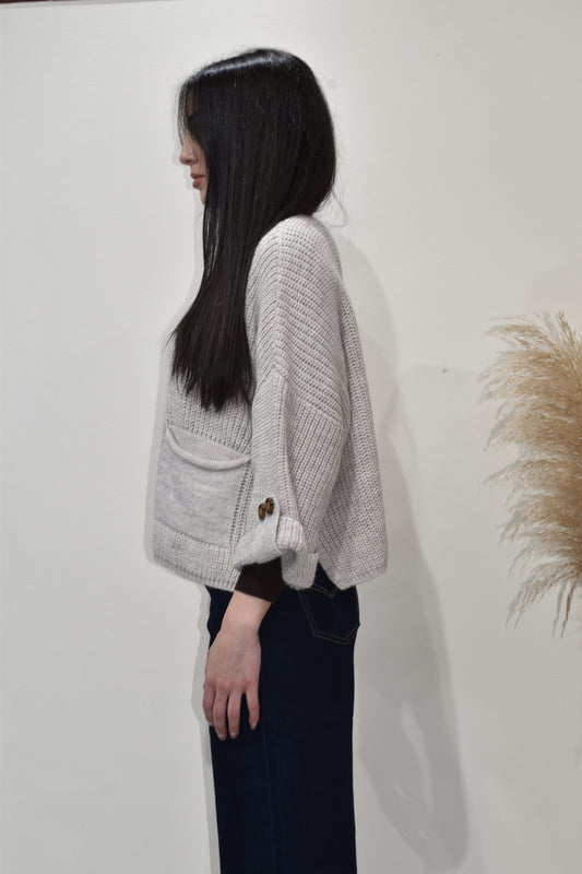 Prezzo di listino €54,99Prezzo di listinoPrezzo unitario / perPrezzo scontato €54,99Cardigan oversize in maglia grossa, caratterizzato da una linea morbida e confortevole che valorizza il look con un’eleganza disinvolta. Il modello presenta una lavorazione a punto largo, scollo a V e chiusura frontale con maxi bottoni effetto tartaruga. Le maniche ampie possono essere portate arrotolate e fissate grazie ai bottoni laterali coordinati, mentre le due tasche frontali applicate aggiungono funzionalità e stile. Contiene una piccola percentuale di lana.