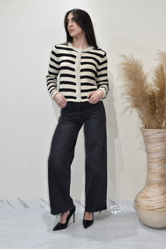 Prezzo di listino €29,99Prezzo di listinoPrezzo unitario / perPrezzo scontato €29,99La maglia è un modello versatile che può essere indossato sia come top sia come cardigan aperto. Realizzata in una lavorazione a maglia morbida, presenta un’elegante fantasia a righe orizzontali nere e panna, dal carattere classico ma sempre attuale. La scollatura e l’abbottonatura frontale sono impreziosite da un bordo decorato con perle e luminosi dettagli gioiello che aggiungono un tocco raffinato e femminile.