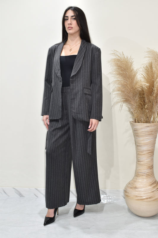 Elegante completo in tessuto grigio antracite gessato, arricchito da micro-brillantini che donano luminosità discreta e raffinata.La giacca presenta una linea moderna con spalline strutturate, revers classici e chiusura a un bottone. È dotata di cintura abbinata per segnare la vita e valorizzare la silhouette.