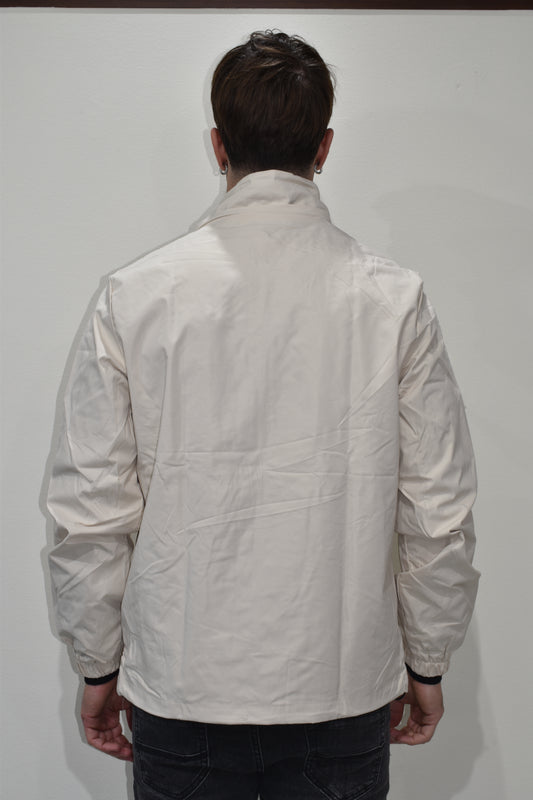 Giacca a vento in tessuto impermeabile, progettata per garantire massima protezione e leggerezza. Presenta zip a scomparsa, cappuccio removibile e tasche funzionali con chiusura termosaldata, per un look tecnico e raffinato. Proposta in questo elegante tono panna, è disponibile anche nella variante nera.