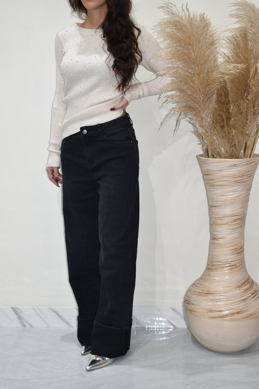 Jeans a gamba dritta in denim nero leggermente elasticizzato, comodi e versatili. Vestibilità morbida ma femminile, vita alta che slancia e risvolto sul fondo per un tocco moderno. Perfetti per look casual o più eleganti.