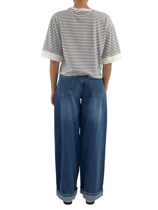 Jeans in denim nero, caratterizzati da una gamba larga e dritta, che dona un look moderno e slanciato. La vita è regolare e la struttura del tessuto appare morbida ma consistente. Il fondo presenta un ampio risvolto cucito, dettaglio che aggiunge un tocco di stile distintivo e contemporaneo. Un capo versatile, facile da abbinare sia in outfit casual che più raffinati. -