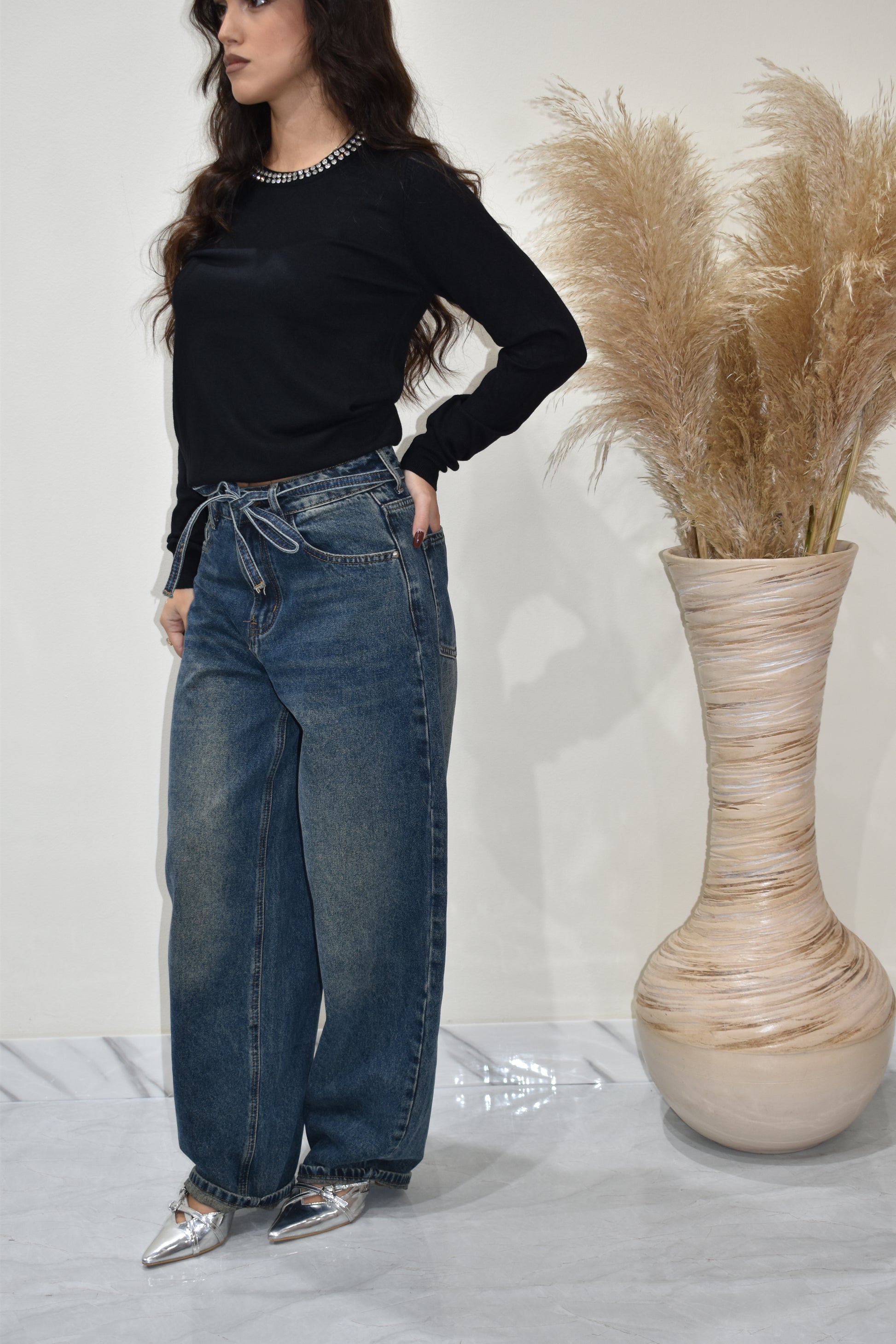 Jeans mom fit con lavaggio medio scuro effetto vintage, dotato di laccetto in denim in vita. Modello super di tendenza, comodo e versatile, perfetto da abbinare a qualsiasi tipo di look.