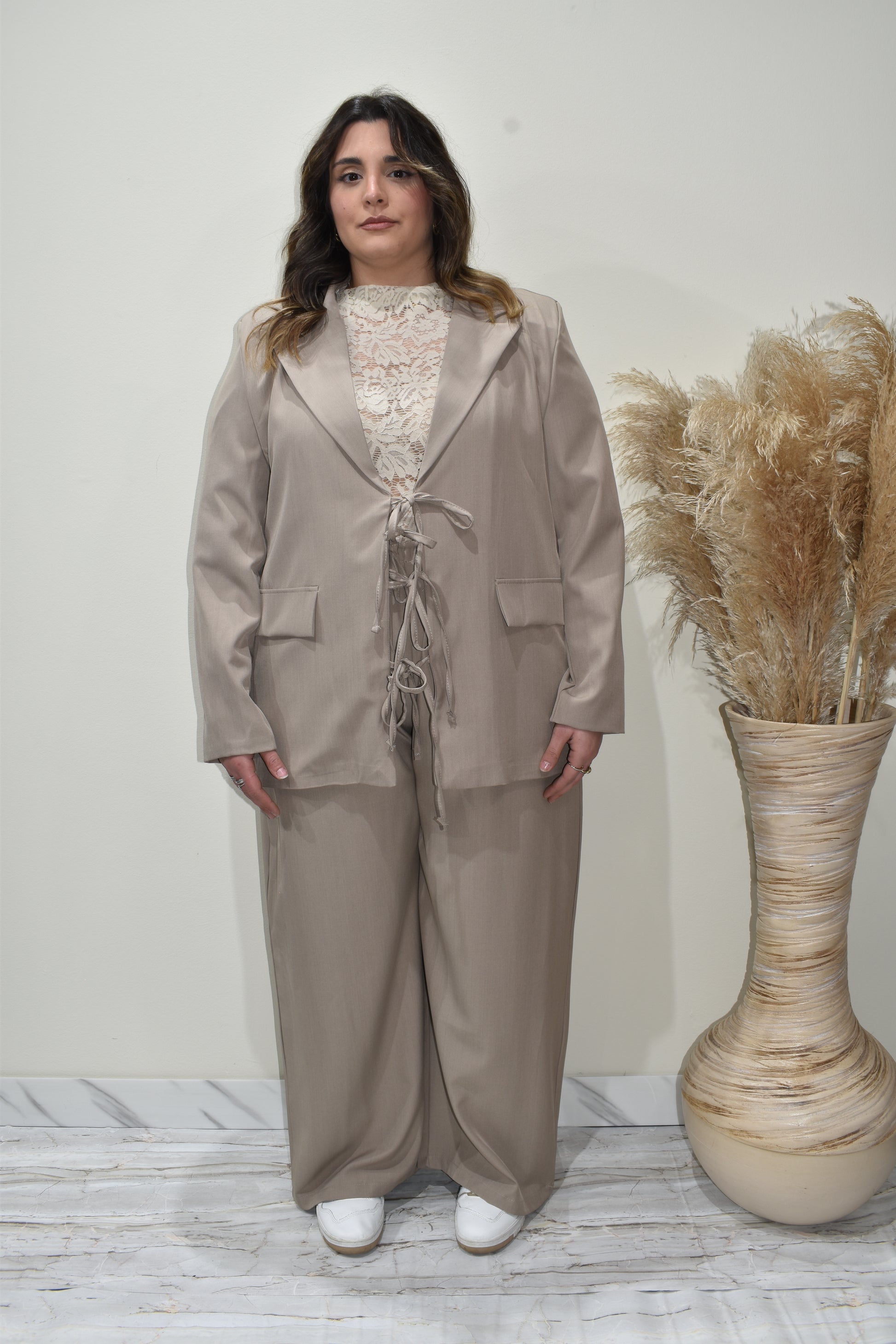 • Tailleur donna dalla silhouette generosa e raffinata, pensato per valorizzare le forme con eleganza. Realizzato in tessuto di qualità, offre una vestibilità confortevole senza compromessi stilistici. La giacca strutturata e i pantaloni a vita alta creano una linea armoniosa, perfetti per occasioni professionali e formali. Un capo versatile che trasmette sicurezza e femminilità, ideale per chi desidera un look impeccabile e sofisticato.