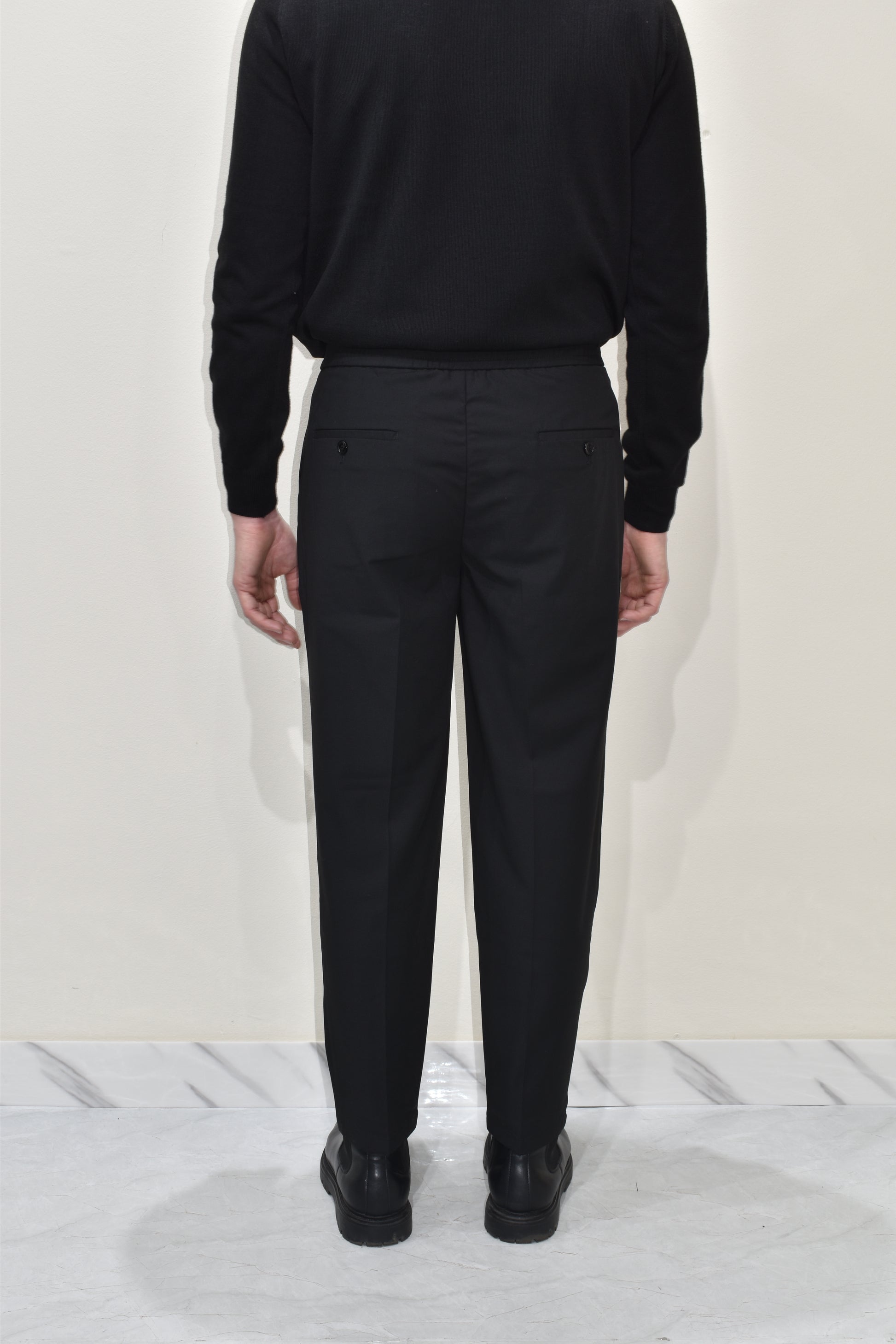 Pantalone classico da uomo in tinta unita nera, caratterizzato da una linea pulita e moderna. Presenta una vestibilità slim con piega centrale, tasche laterali e tasche a filetto sul retro con bottoni. Un capo versatile e sofisticato, ideale per look formali e business.