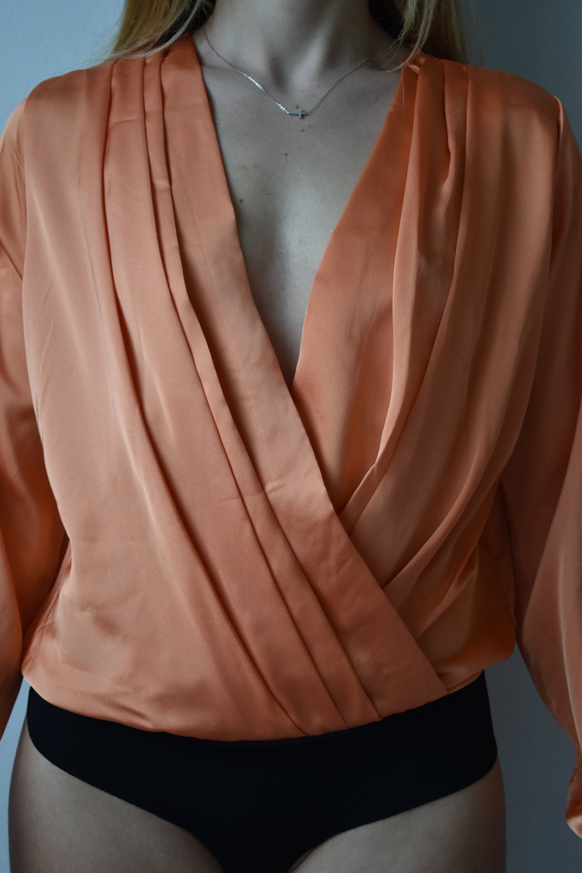 Il body in raso con scollo a V profondo è un capo di abbigliamento femminile elegante e sensuale. Realizzato in tessuto di raso, noto per la sua lucentezza e la sua texture morbida, questo body presenta uno scollo a V profondo che valorizza il décolleté in modo audace e affascinante. Il tessuto di raso conferisce al capo un aspetto sofisticato, perfetto per occasioni speciali o serate glamour. La silhouette aderente del body offre una vestibilità impeccabile, mentre la chiusura a scatto o bottoni nella parte inferiore assicura una comoda vestibilità senza sbuffi. È un capo versatile che può essere indossato da solo con pantaloni a vita alta o gonne lunghe per un look chic e seducente, oppure sotto una giacca o una blusa trasparente per aggiungere un tocco di eleganza e sensualità al look complessivo.